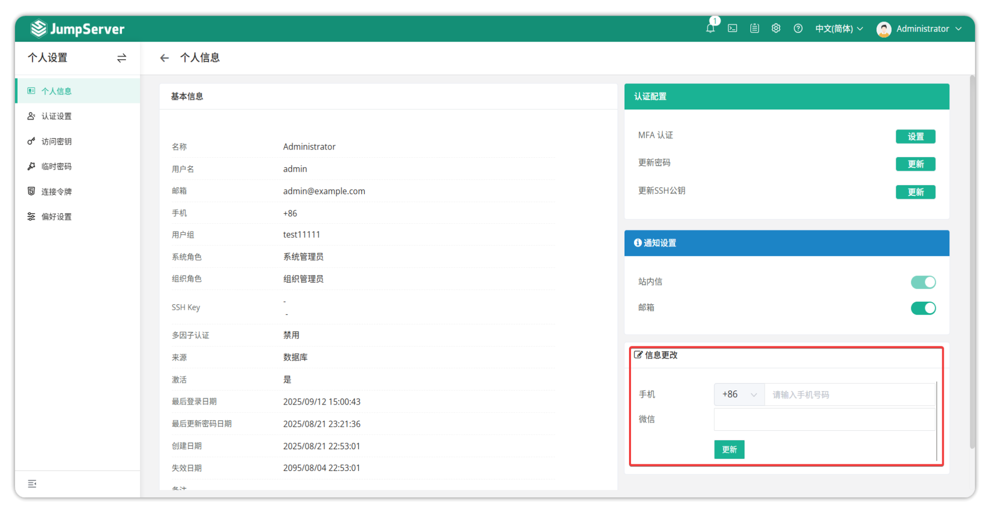 修改其他管理员用户方法与修改普通用户的 MFA 相同,使用更新用户即可。