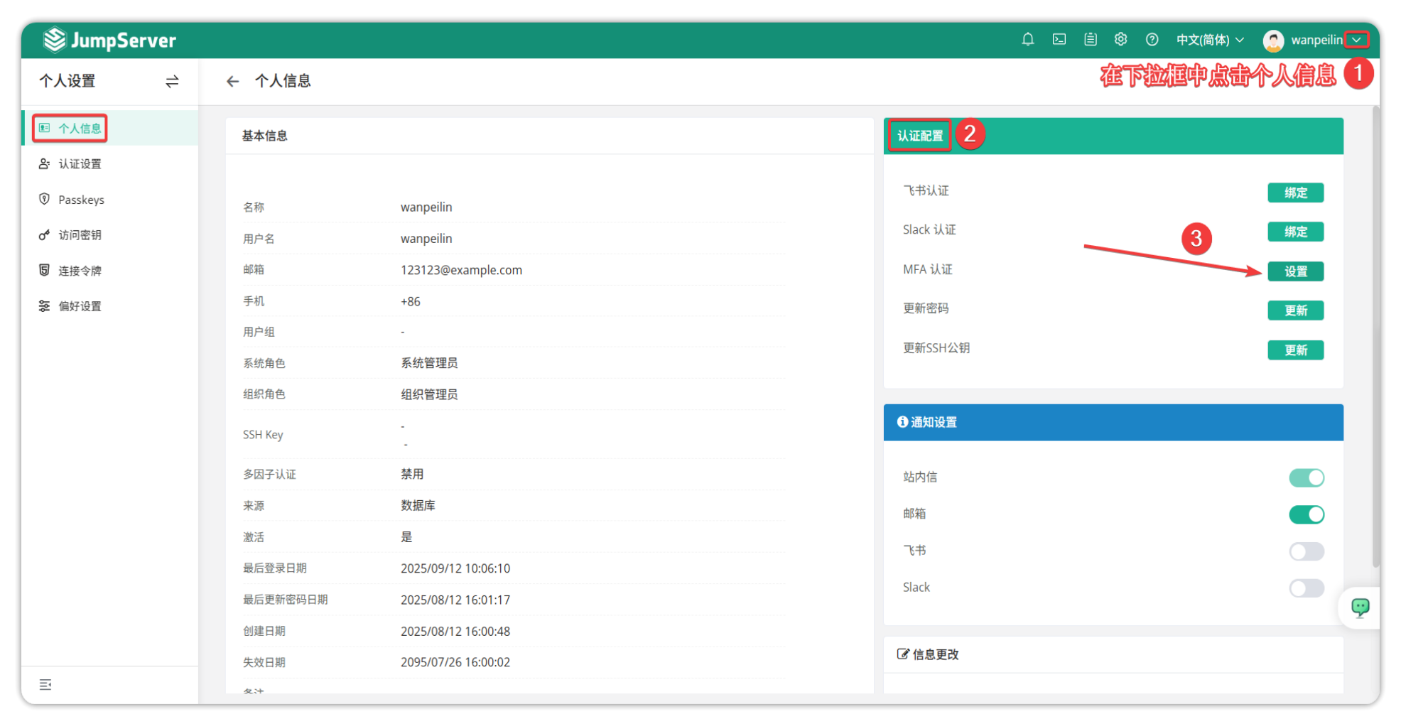启用:启用 MFA,但用户首次登陆后可在页面上手动关闭。可以依次点击用户右上角个人信息→认证配置→MFA认证:
