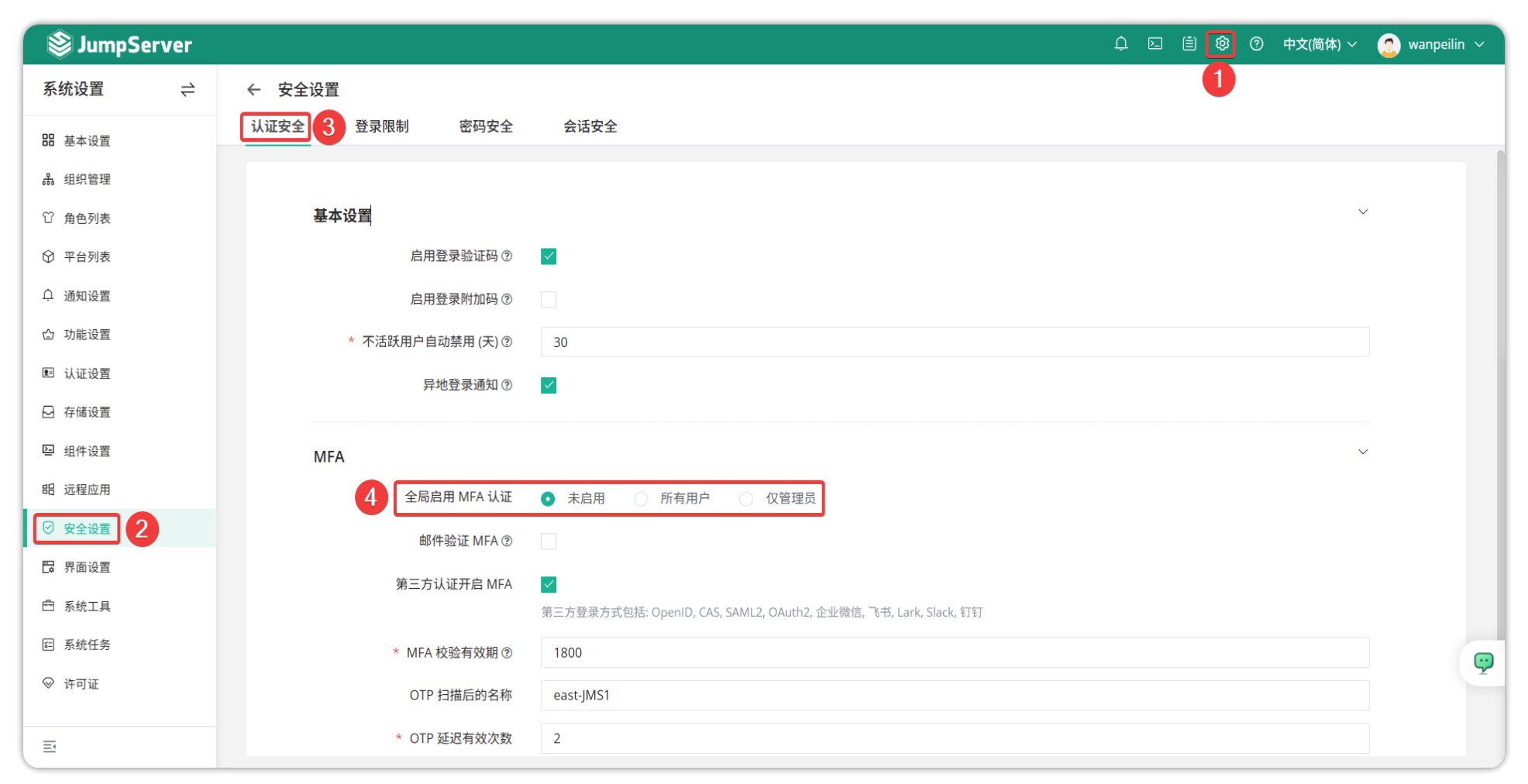 JumpServer 可以针对于全员开启 MFA 双因子认证,按钮位于:系统设置→安全设置→认证安全→MFA 中。