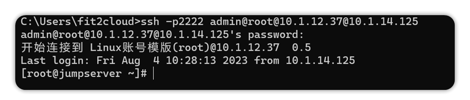ssh -p2222 jumpserverUsername@systemUsername@AssetIP@jumpserverHostIP解释: