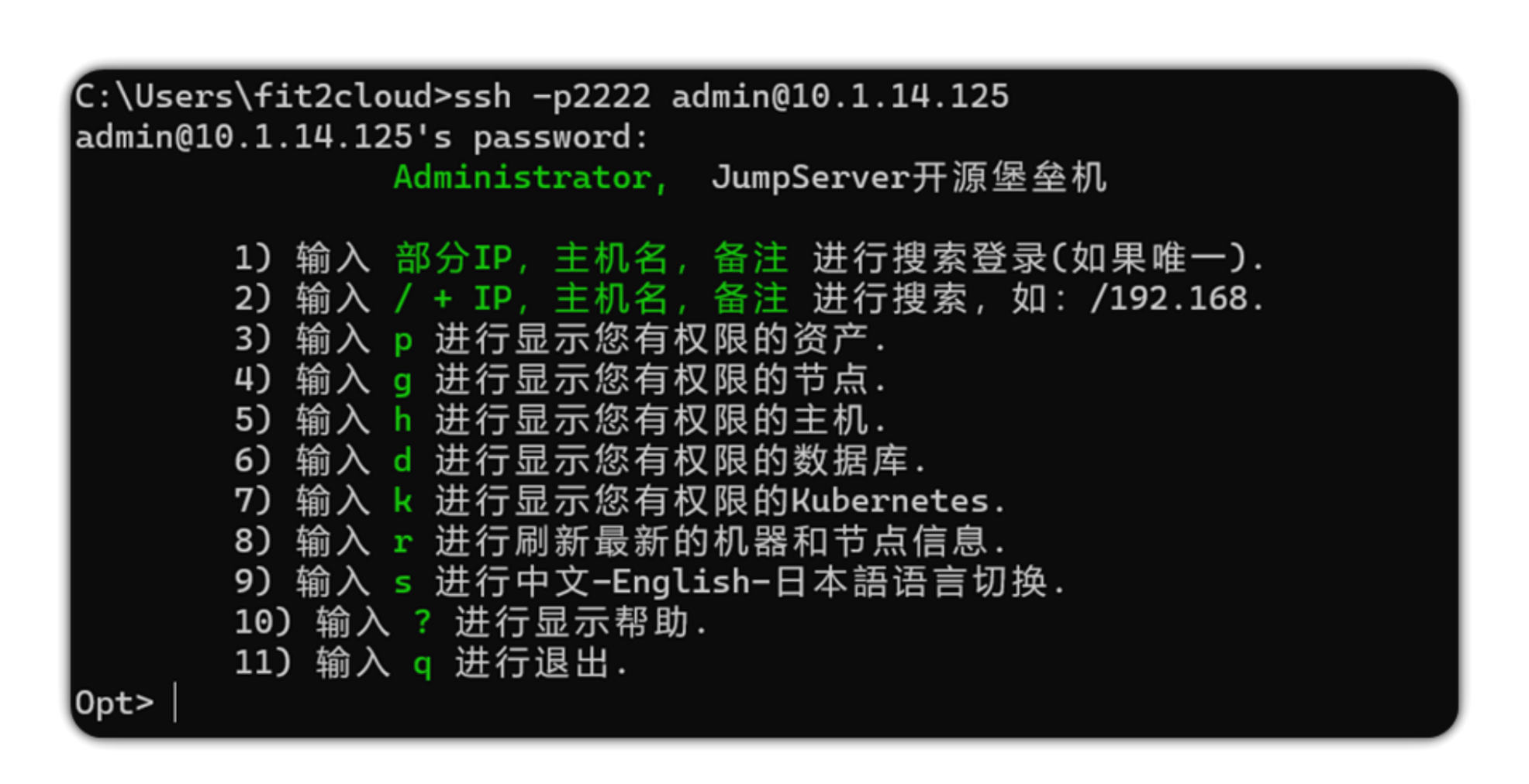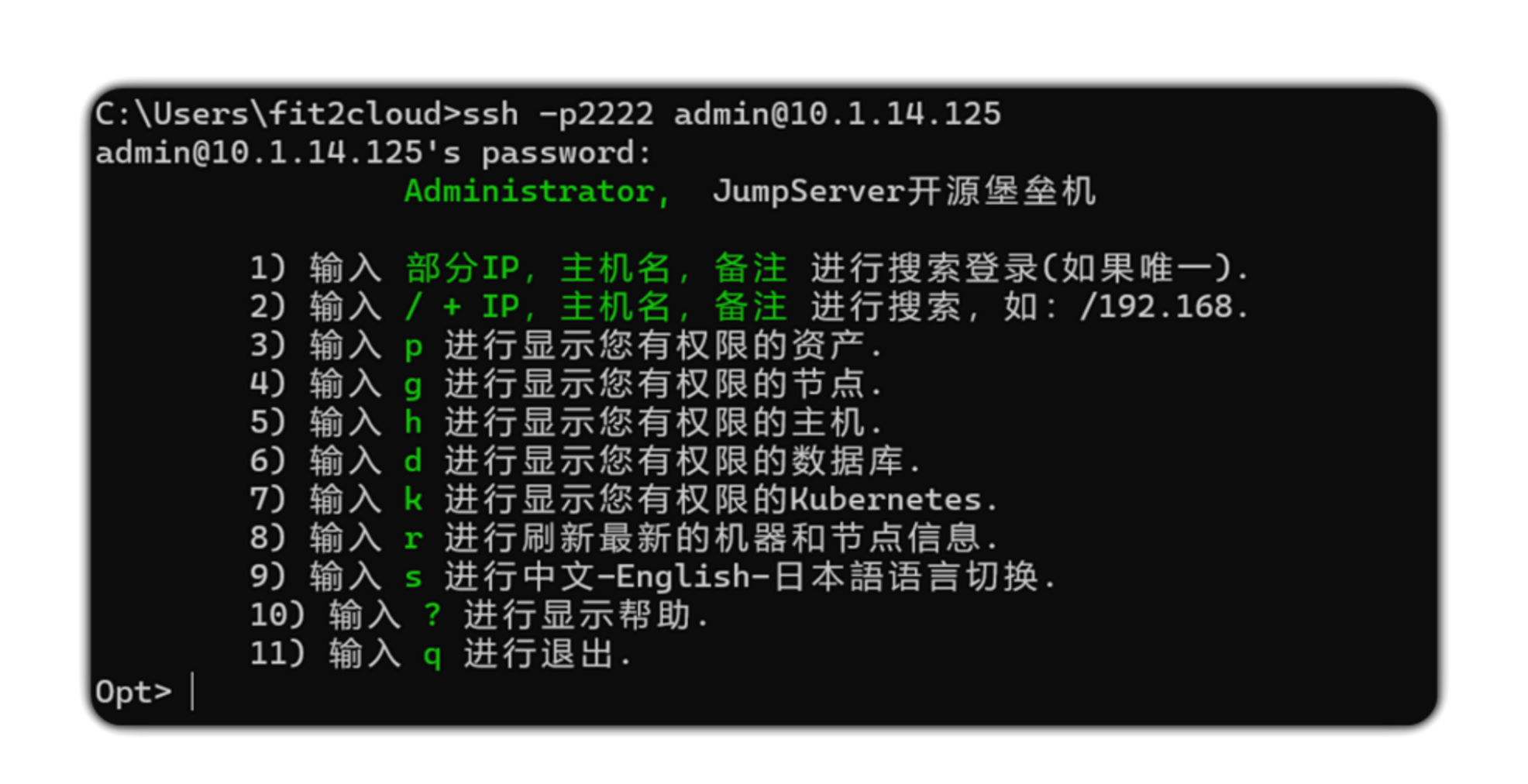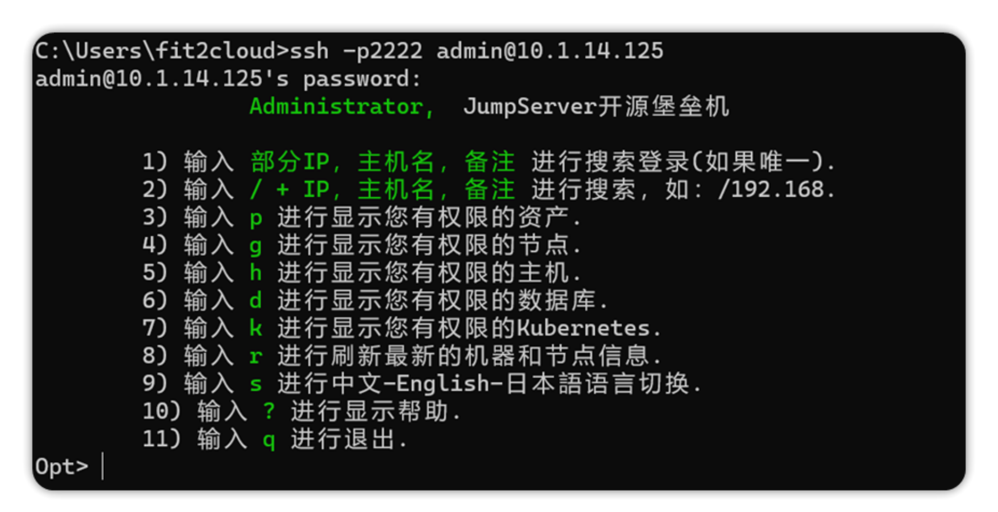 ssh -p2222 jumpserverUsername@jumpserverHostIP解释: